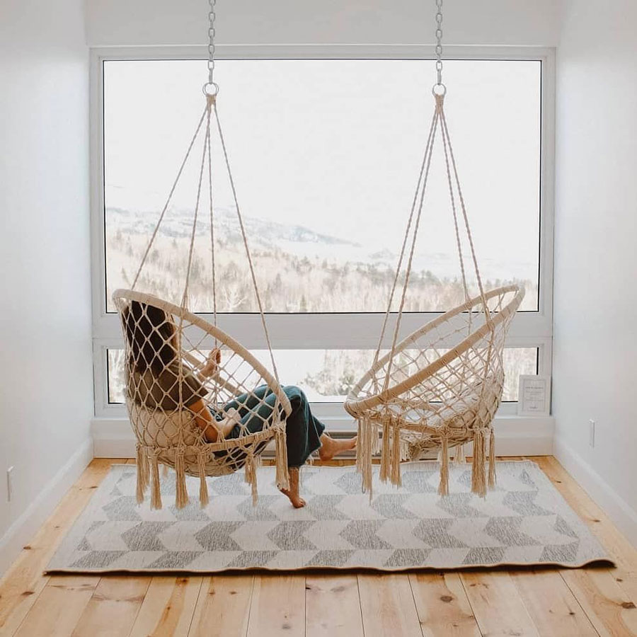 The most common technique used for the construction of a basket hanging chair is the wicker. Effortlessly cradling you as you float, this chair (also available in white) is a surefire crowd pleaser. The fabric and armature are configured to "embrace" If you don't have any materials with you and only have a swing and a nylon rope, you can do a running bowline knot to hold your swing in place. I purchased one of those indoor hanging swing chairs for kids, specifically this one, which is meant to be mounted in the ceiling with a single eye bolt. Soft rope chairs, also known as hammock chairs, create a swaying, cozy nook in which to relax and enjoy conversation, a good book or a nap. 5 out of 5 stars with 1 ratings. This is where you will hang your egg chair. Another option is to use this kind of chair in the garden in your cottage. This is pretty tight, so i need to mount pretty much in the middle. See more ideas about hammock chair, hammock chair stand, hanging chair. Try hanging chairs and they will surely become your №1 in the list. Cut the rail so that it is square on one end.